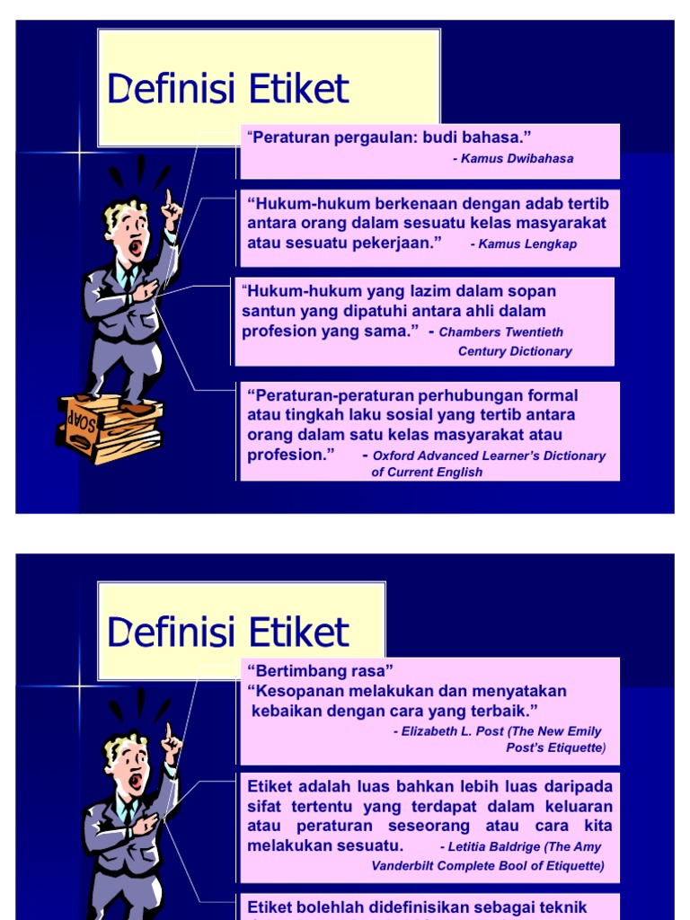 Etiket juga merupakan perilaku seseorang yang dianggap sesuai dengan kepribadian dan gaya hidupnya. Tempat tinggal yang biasa, padang rumput, kandang, kebiasaan/adat, akhlak,watak, perasaan, sikap, cara berpikir. Etiket berasal dari bahasa prancis yaitu etiquette yang bermakna kartu undangan kerajaan.menurut kamus besar bahasa indonesia, etiket memiliki pengertian yaitu sopan santun. Wir liefern schnell und zuverlässig. Tempat tinggal yang biasa, padang rumput, kandang, kebiasaan/adat, akhlak,watak, perasaan, sikap, cara berpikir. Etiket merupakan suatu sikap seperti sopan santun ataupun aturan lainnya yang mengatur hubungan antar kelompok manusia yang beradab dalam suatu pergaulan. Estetika merupakan nilai keindahan suatu benda. Bagian tersebut dikenal dengan istilah etiket gambar. Etiket berasal dari bahasa perancis, yaitu etiquette yang berarti sopan santun. Pengertian etika dan etiket istilah etika berasal dari bahasa yunani kuno. Ethos mempunyai banyak arti yaitu : Dan cara berfikir 'ta etha', berarti adat kebiasaan. Pengertian etiket dan etika sering dicampuradukkan, padahal kedua istilah tersebut terdapat.